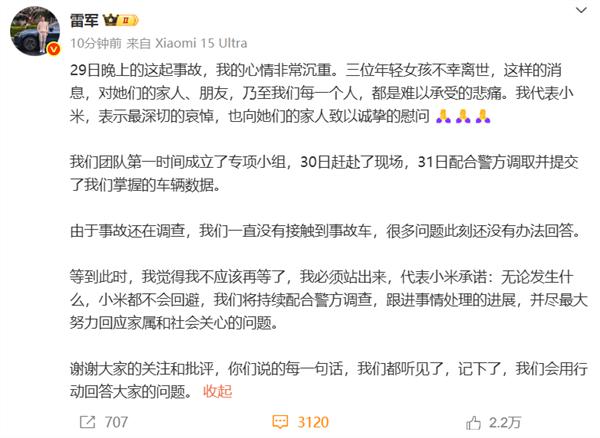雷军说,事件发生后,小米立即成立了一个专门的小组,配合警方获取并提交了我们掌握的车辆数据。因为事故还在调查中,我们从来没有接触过事故车辆,目前还没有办法回答很多问题。