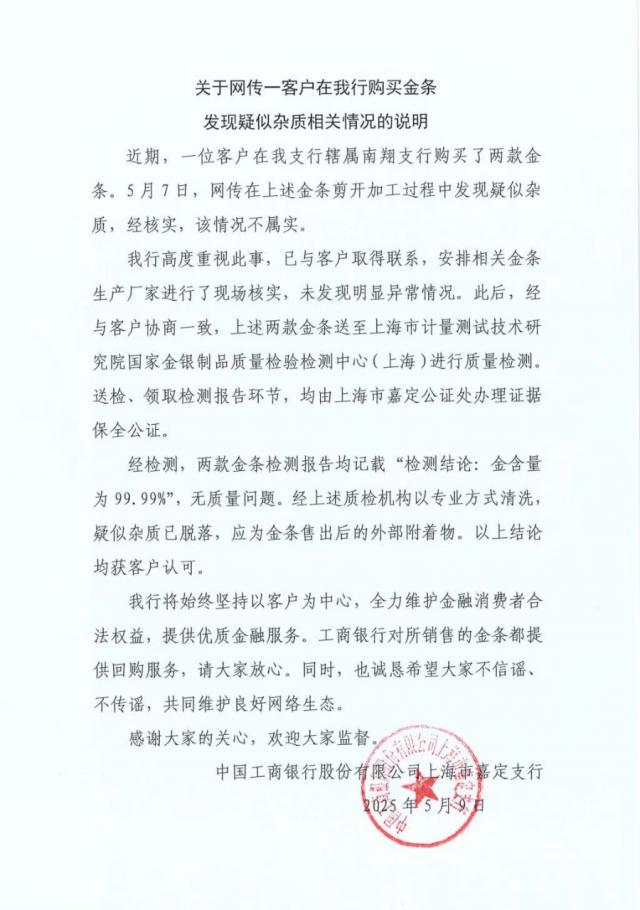 21 《世纪经济报道》记者从工商银行了解到,涉案银行是工商银行上海嘉定分行,分行回应称,近日,一位客户在上海嘉定区南翔分行购买了两枚黄金。5 月 7 日本,网爆在上述黄金剪切加工过程中发现疑似杂质,经核实,这种情况并非真实。