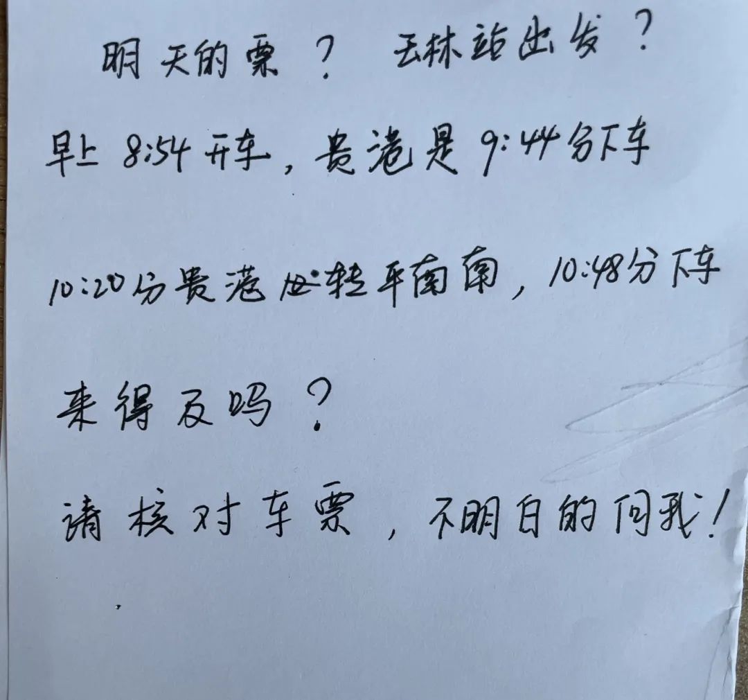 在纸上,吴玲丽迅速写下了班次信息、出发时间、贵港站中转路线和换乘时间:
