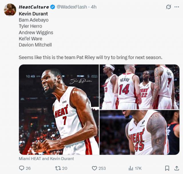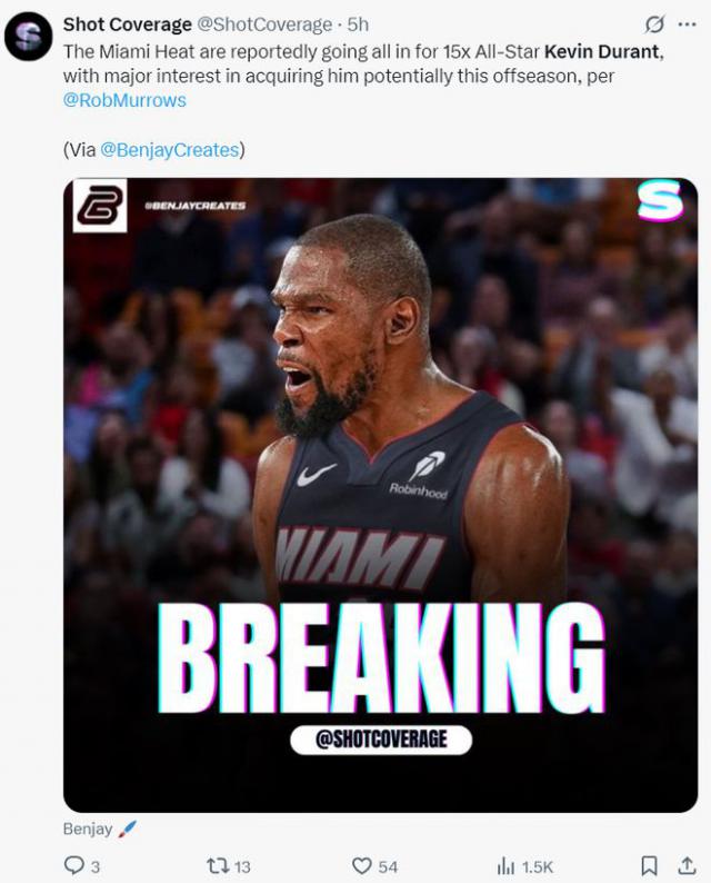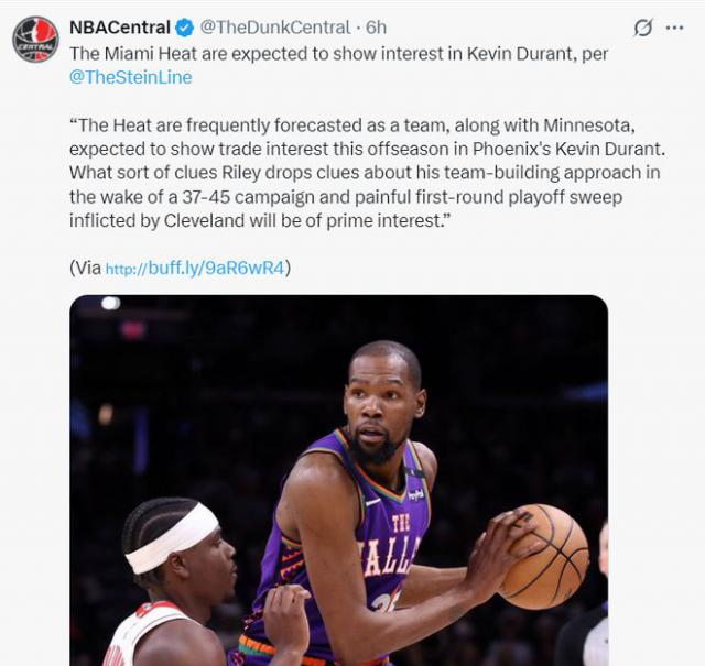 几乎在同一时间,NBA 记者马克 - 斯坦恩爆料说,森林狼和热火有望在休赛期对杜兰特的交易感兴趣。热火经历了常规赛 37 胜 45 在季后赛第一轮被骑士狂扫之后,帕特 - 莱利对他的团队建设方式提出了质疑,他们希望改变新的方式。