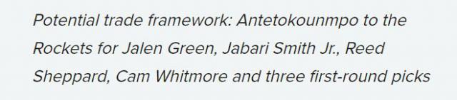 潜在交易框架:字母哥加入火箭队,以换取杰伦。 - 格林,小贾巴里 - 史密斯、谢泼德、惠特莫尔和 3 个首轮签