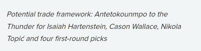 潜在交易框架:字母哥加入雷霆,换来哈尔滕施泰因、卡森。 - 华莱士,托皮奇和 4 个首轮签
