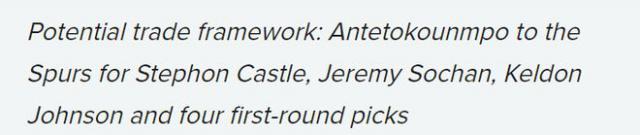 潜在交易框架:字母哥加盟马刺,换来卡斯尔、索汉、凯尔登。 - 约翰逊以及 4 个首轮签
