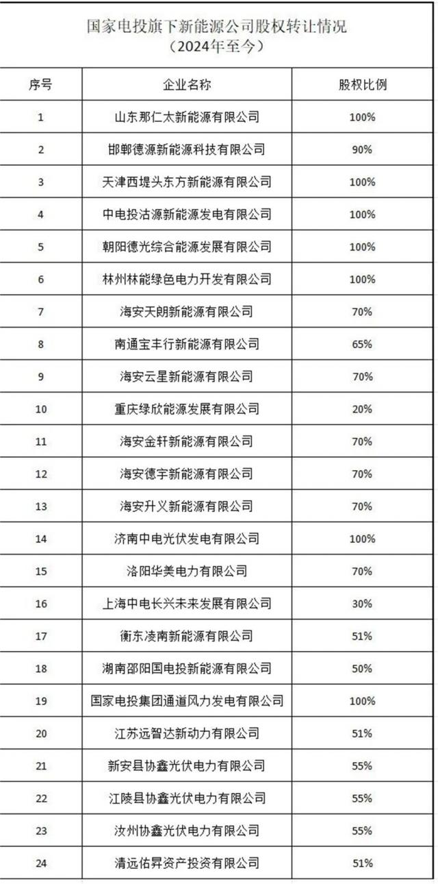 2024 年 7 1月,国家电力投资进一步提出“平衡增长战略”,通过提高股票质量和增量来推动平衡。此后,公司实施了几次资产重组,并频繁上市其资产产权。据不完全统计,截至 2024 年底,国家电力投资公司共出让。 24 家庭新能源公司股份。