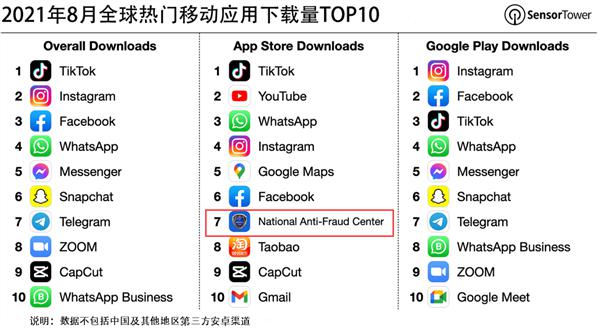 国家反诈骗中心 App 于 2021 年 3 月 15 移动应用数据分析公司每天正式上线 Sensor Tower 数据显示,国家反诈骗中心 App 在 2021 年 8 每月进入全球热门移动应用下载量 排名第一的TOP10 7。