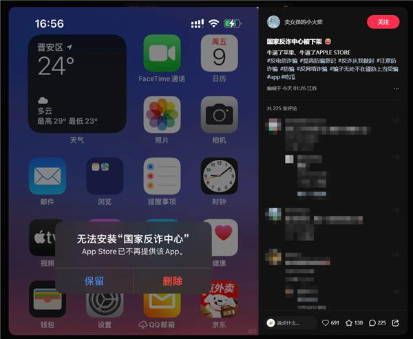 快科技 5 月 11 日前,有网友在社交平台上发帖称,苹果日前, App Store 应用商店不能下载国家反诈骗中心 App,网页提示“国家反诈骗中心不能安装,苹果 App Store 这个已经不再提供了 App "。