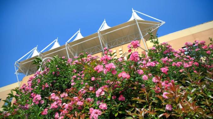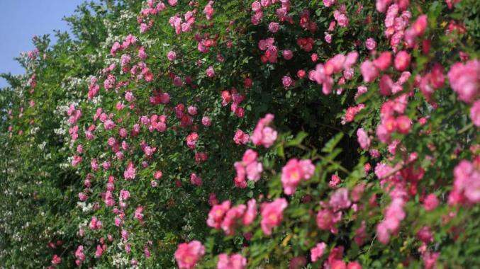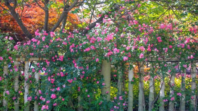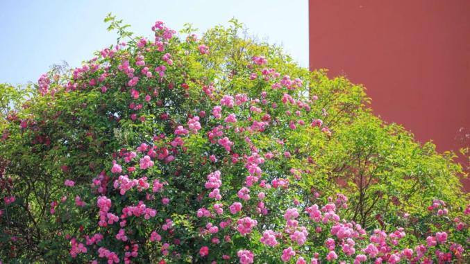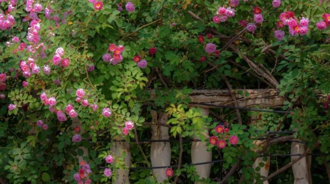 日照处处的玫瑰墙,肆意生长,绚烂绽放。