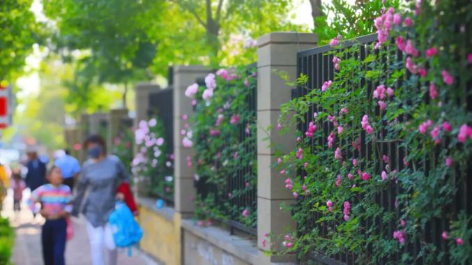 玫瑰沿着护栏生长,阳光透过树影斑驳地洒在路上,为玫瑰覆盖了一层宁静的美。