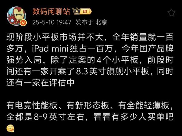 近日,博主“数码聊天站”透露,今年国内品牌强势进入小屏幕平板领域,除了定案外, 4 一个小平板,不久前又有一个案子开了。 8.3 同时,还有一个英尺旗舰小平板,这意味着今年可能会有高达一个。 6 国产小屏平板的出现。同时透露,这些新平板有电子竞技性能板、新形态板和全能轻薄板,都是 8-9 英尺上下。考虑到现阶段小平板市场不大,年销售额超过一百万,iPad mini 独占一百万,不清楚这些国产小平板最终会有多少人买单。
