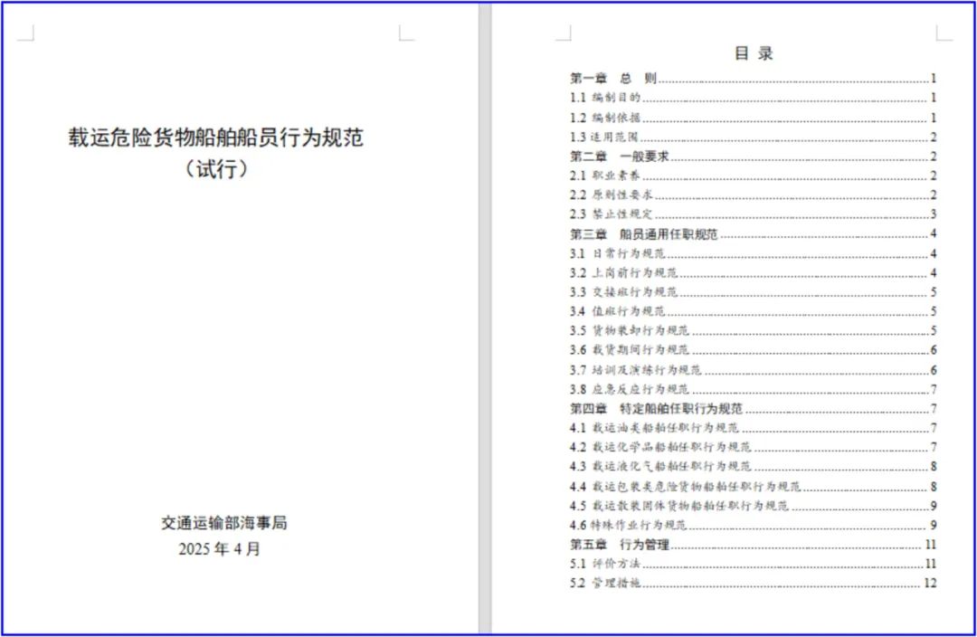 2025年4月,交通运输部海事局编制发布了《载运危险货物船员行为规范(试行)》(以下简称《规范》),旨在为载运危险货物的船员有效履行职责提供指导,确保船舶载运危险货物的安全。