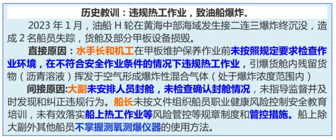 《规范》:4.1.1 遵循防火、防爆、消防、抗静电、防杂散电流、照明、气体检测、通风、人员保护、通道设置、应急设施设备、海岸安全检查、信息交换等相关要求。4.1.2 惰化工作、货物加热工作、热工作、清洗(清洗)舱工作、封闭场所工作、过驳工作等都要按照有关标准和规程进行。