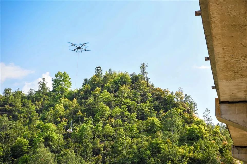 在黄坦镇前巷村,无人机操作员手持对讲机,与负责苗木装卸的对面山区工作人员密切沟通,根据现场情况灵活准确地调整飞行路线。同时,地面工作人员也在分秒必争,迅速为无人机配备苗木。整个过程充满默契,每一个环节都顺畅有序,完成了无缝连接。随着无人机的轰鸣声,我看到无人机稳稳地悬挂着苗木,在山林中自由灵活地行走。从起飞到着陆,苗木上山的“点对点”运输在短短2分钟内顺利完成。无人机技术在这种高效运输方式的背后发挥着作用。