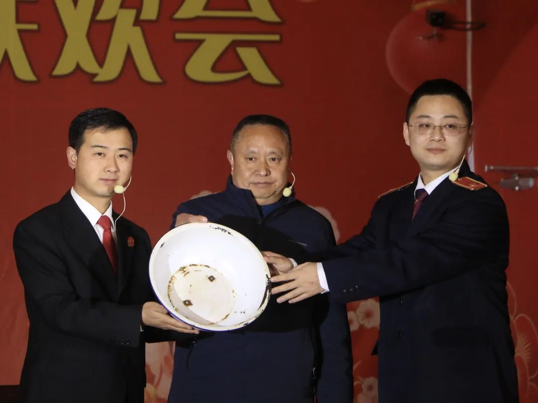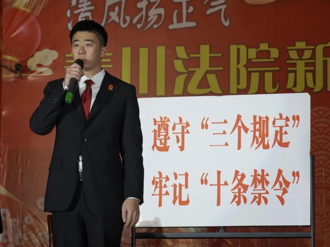 图为竹园人民法院负责人在春节文化表演中将法院办理的一起执行案件改编成小品的场景。照片中的展板“遵循‘三个规定’,牢记‘十个禁令’”显眼,体现了法院人在实际工作中坚守纪律和规则,用铁律筑牢公正的司法防线,弘扬微风正气的日常生活。同时也凸显了青川县人民法院正在积极开展的“法院自审自执”工作与廉洁自律、拒腐防变密切相关。