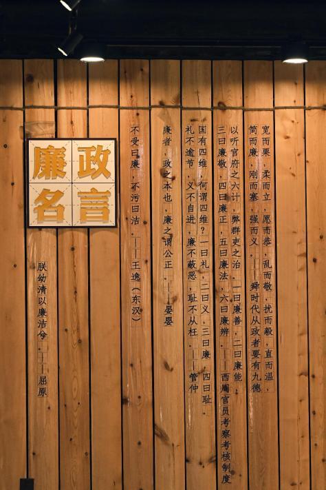 在这面廉洁的文化墙上,“教以养廉”、“制度保廉”、“依法促廉”、“节俭帮廉”的十六字显眼口号传达了廉洁的理念,但简洁有力的文字却生动地反映了反腐倡廉教育的每一个细节,时刻提醒观众敬畏、遵守制度、依法行事、崇尚节俭、筑牢廉洁自律的防线。