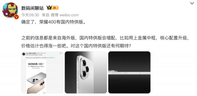 网爆荣耀 400 这个系列将分别是骁龙 7 Gen4 和骁龙 8 Gen3 Cpu。