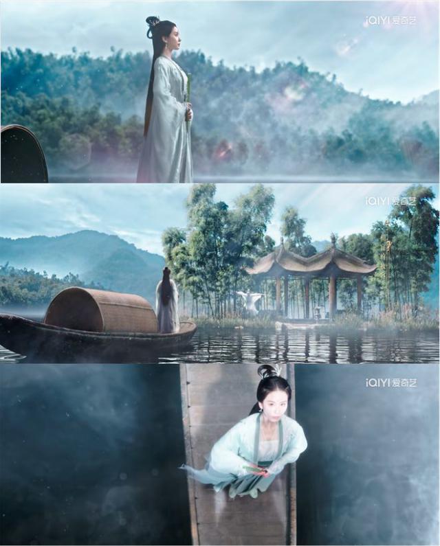 整部电影也是如此。七月初七,著名场景之一的男女主持人约在淮水竹亭。男主持人等了很久,女主持人坐船出现了。人物和背景的层次分离非常明显。为了呈现美丽的江南风光,他们用雾蒙蒙的滤镜削弱了真实感。演员画面甚至填满了柔光滤镜,看不到真实的皮肤纹理,只有略显模糊的五官。