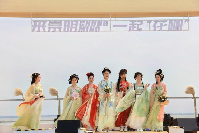 下午,河堤变成了古典剧院。在汉服展览比赛中,选手们像花一样流仙。花神巡游团队沿着堤坝前行,裙子掠过墙绘猫,仿佛古今在这一刻温柔地相遇。