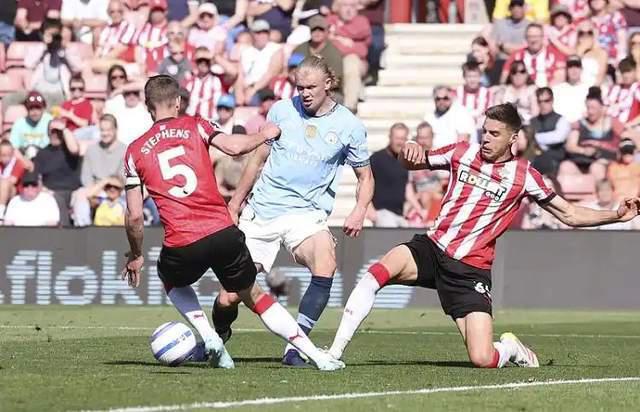 在足球比赛中打破密集防守的两大武器,一是速度型球员的无理突破,二是雷区周围的远射。不过,福登和麦卡蒂在这场比赛中的首发技术还不错,但是速度和突破都不是优势。因此,曼城在进攻端很难通过起高球传中等方式找到哈兰德,只能依靠短传渗透来寻找机会。但是对手在后场囤积了大量的军事力量,使得曼城的传递举步维艰,哈兰德也被淹没在人山人海中。