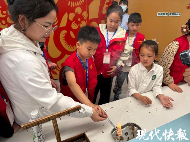 接着,中医拿出一团蓬松的艾绒,演示如何揉成小锥形艾柱。"每个人都可以和我一起试试。“在中医的鼓励下,小记者们伸出手,抓起艾绒开始效仿。过了一会儿,不同形状的艾柱出现在孩子们的手心。中医引燃艾柱,袅袅青烟升起,在保证安全的环境中,独特的草药香味瞬间弥漫。通过这种有趣的互动感受,孩子们对什么是中药、中药的四气五味有了启蒙的认识。