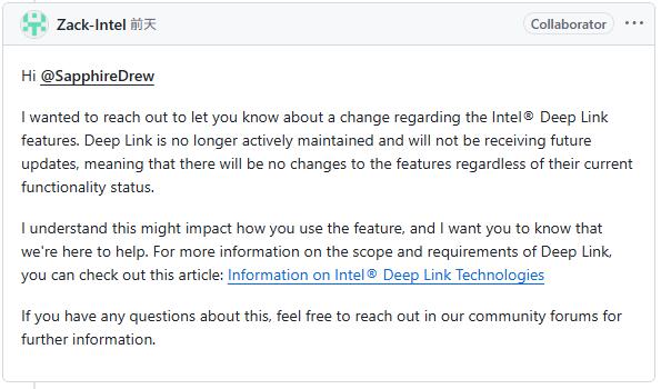 依据英特尔员工 Zack 前一天的说法,Deep Link 有关技术已经不再主动维护,未来也不会更新,其目前的功能状态将保持不变。