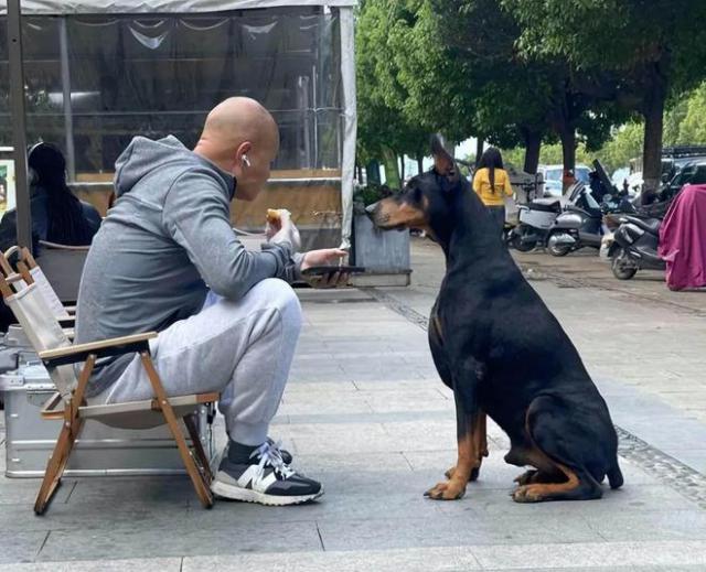 一个人坐在路边,边吃边看手机,旁边还跟着一只杜宾犬。