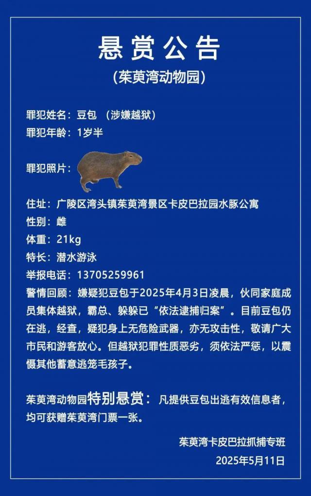 5 月 11 日上午,扬州市山茱萸湾风景区管理处官微发布悬赏公告,称山茱萸湾动物园卡皮巴拉豆包在山茱萸湾 2025 年 4 月 3 日出逃,至今已达 40 天。