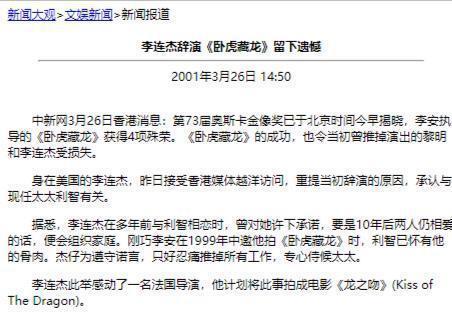 在拍摄《卧虎藏龙》时,李安最初的主角是李连杰。