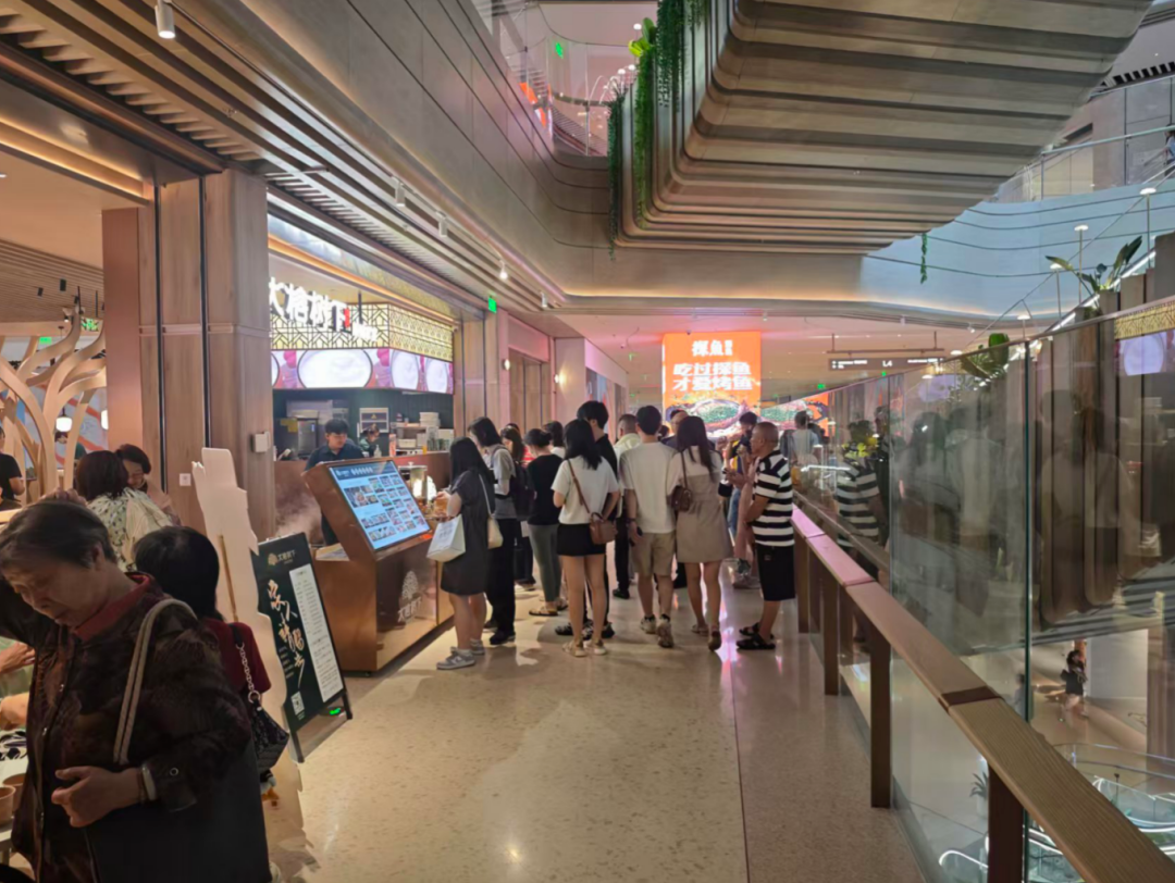 临近中午,费大厨、绿茶、霸王茶姬等著名连锁餐厅已经排起了长队。