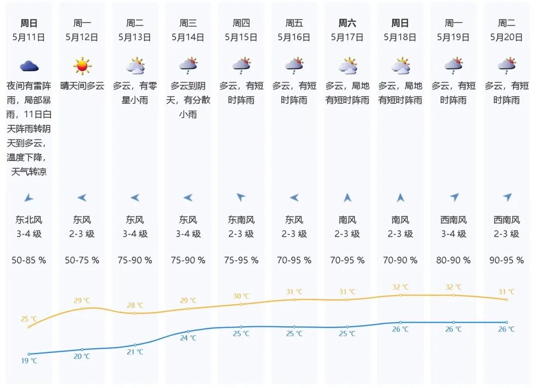 五月十一日,夜间有雷雨,局部暴雨,十一日白天阵雨转阴至阴天,气温下降,天气转凉;19℃-25℃;东北风3-4级;相对湿度50-85 %。