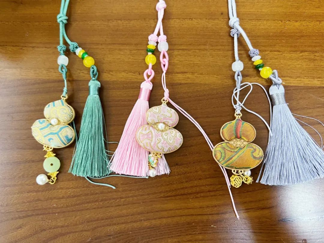 活动中,老师阐述了宋锦的历史渊源和工艺特点,并教授了葫芦吊坠的制作技巧。学生们精心挑选面料、切割和缝制,将优雅的宋锦与吉祥的葫芦相结合,制作出精美独特的节日吊坠。现场气氛温馨和谐,很多同学说要把自己做的吊坠送给妈妈表达感激之情。