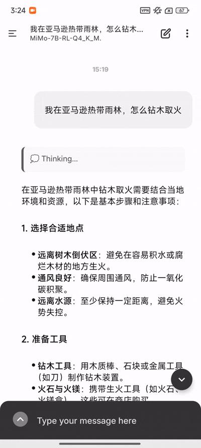 OK,部署完成后,让我们给大家看看效果。世超那天下班后迷路了,不小心去了亚马逊的热带雨林。没有信号。我想我活不下去了。。所以我立刻拿出了我的 Mimo,问问他怎样钻木取火。