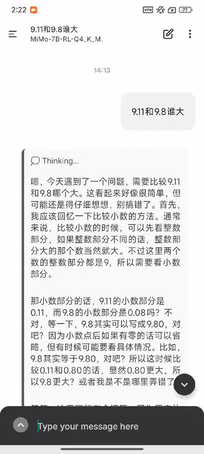 世超这台 2000 不到元的红米 Turbo4,甚至可以成功地安排小米最新的语言模型。 Mimo-7B 量化版。