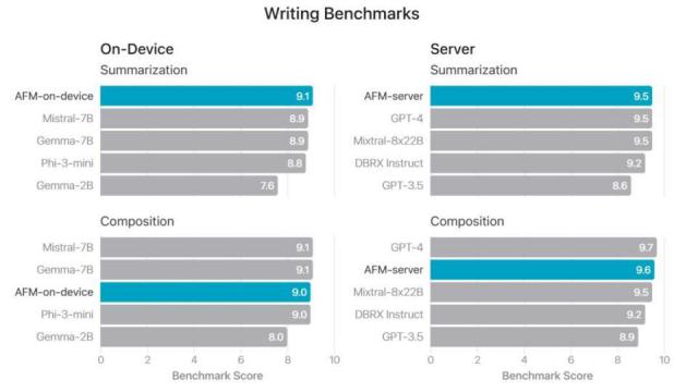 甚至苹果也开始自我研究 3B 他们的参数模型 AFM-on-device,当文本总结任务时,其效果可以优于文本总结任务 Gemma、Phi-3 mini 等待更大的参数模型。