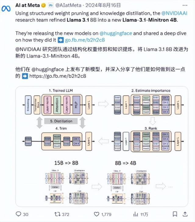 还有修枝量化的方法,简单来说就是把模型中的高精度计算变成低精度计算,不需要很高的性能,这样模型才能跑得更快。去年,英伟达联合 Meta 发布的 Llama-3.1-Minitron 4B AI 模型,就是从原来开始的 8B 模型修枝而来,使模型速度更快,资源更省。