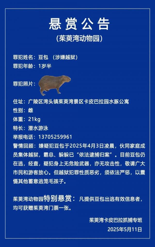 5 月 11 日上午,江苏省扬州市山茱萸湾风景区管理处官微发布悬赏公告,称山茱萸湾动物园卡皮巴拉“豆包”于 4 月 3 日出逃,至今已达 40 上帝。特别奖励:任何提供“豆包”逃避有效信息的人都可以获得茱萸湾门票。(详情请点击:人民日报)