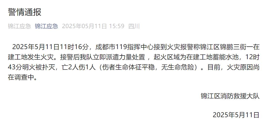 2025年5月11日11时16分,成都市119指挥中心接到火灾报警,称锦江区锦鹏三街一在建筑工地发生火灾。接到报警后,我们团队立即派出力量处理。 ,火灾区是施工现场的储能池。12时43分,明火被扑灭,2人死亡,1人受伤(伤者生命体征稳定,无生命危险)。目前,火灾原因仍在调查中。