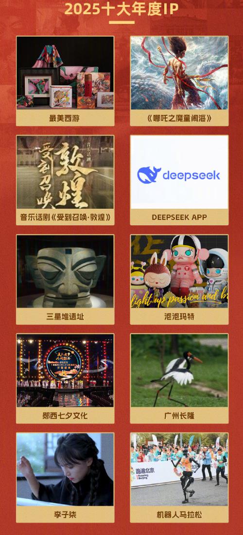 据了解,2025 十大年度 IP 包括《最美西游》《哪吒魔童闹海》、DeepSeek App、音乐剧《被召唤》 · 敦煌》、三星堆遗址,泡泡玛特,七夕文化,广州长隆,李子柒,机器人马拉松。