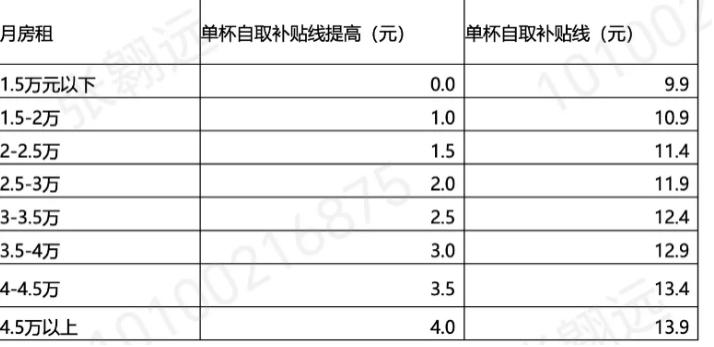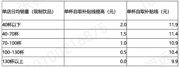 第二,对高租金优质点给予高租金补贴。店内月租金在15,000-20,000元之间,每杯进店额外补贴1元,补贴至10.9元;20,000-25,000元租金,每杯进店额外补贴1.5元,补贴至11.4元;45,000租金以上的店铺,每杯进店额外补贴4元,补贴至13.9元。