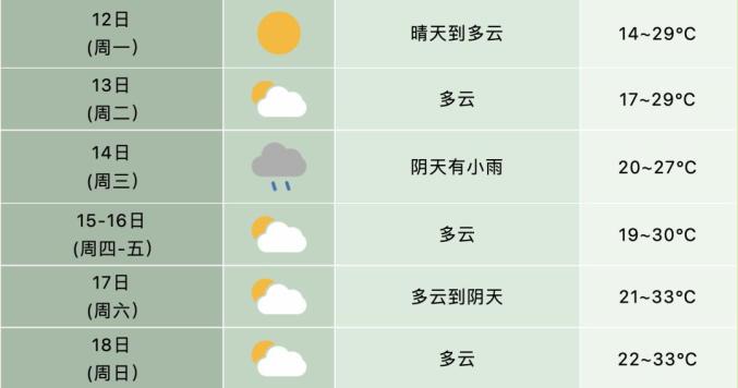 12日(周一):全省阳光明媚到阴天。