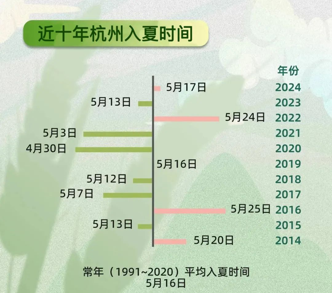 杭州长期进入夏季时间5月16日,最早进入夏季4月29日(1994年),最迟进入夏季6月8日(1985年),今年进入夏季较早。