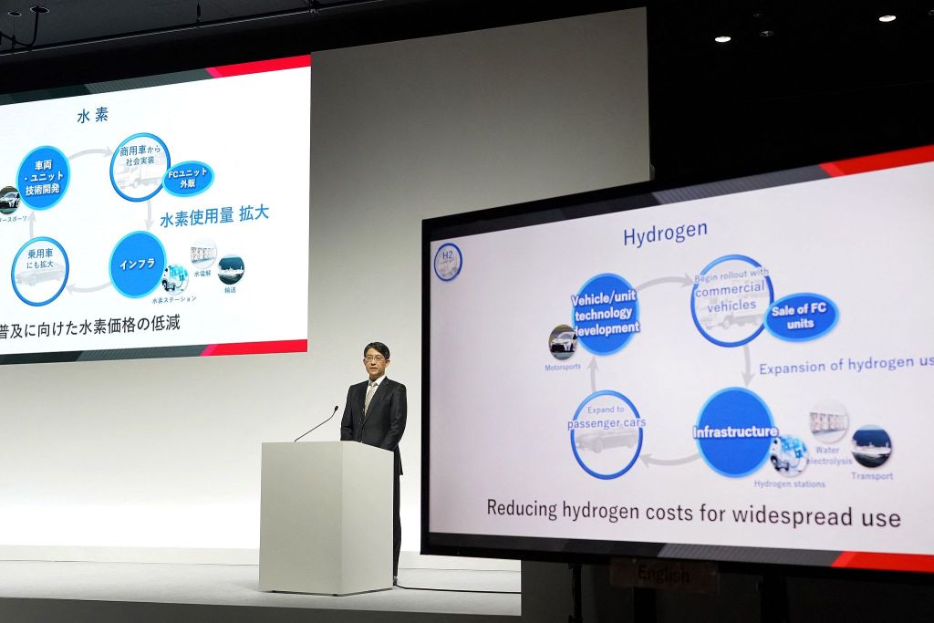 日本东京、丰田汽车CEO佐藤恒治于当地时间2025年5月8日在公司财报新闻发布会上发言。