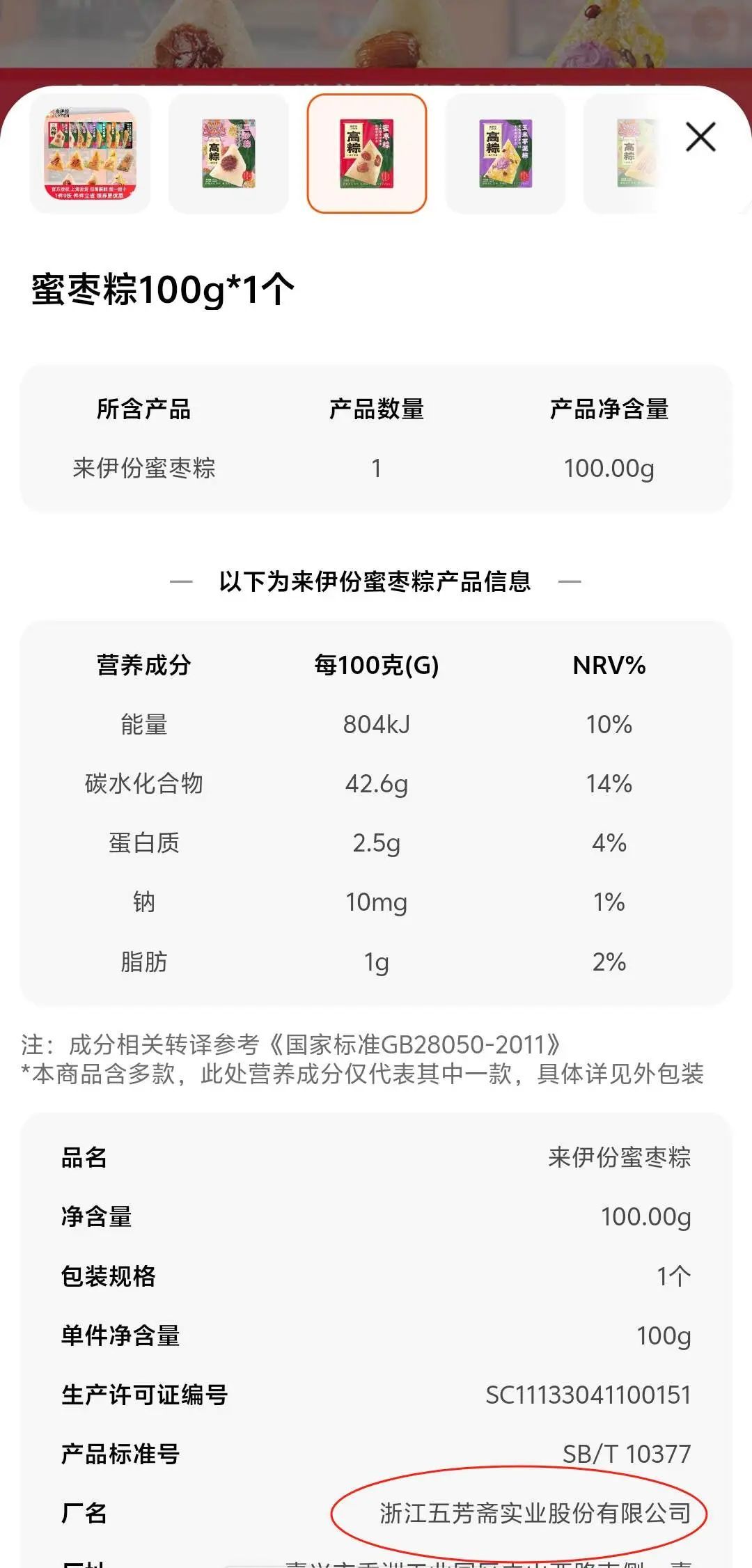 此外,报告还提到,出现问题的蜜枣粽子“生产工厂与五芳斋相同”。小编在淘宝上发现,这款红色包装的“蜜枣粽子”确实来自五芳斋实业!五芳斋也表示会积极配合。
