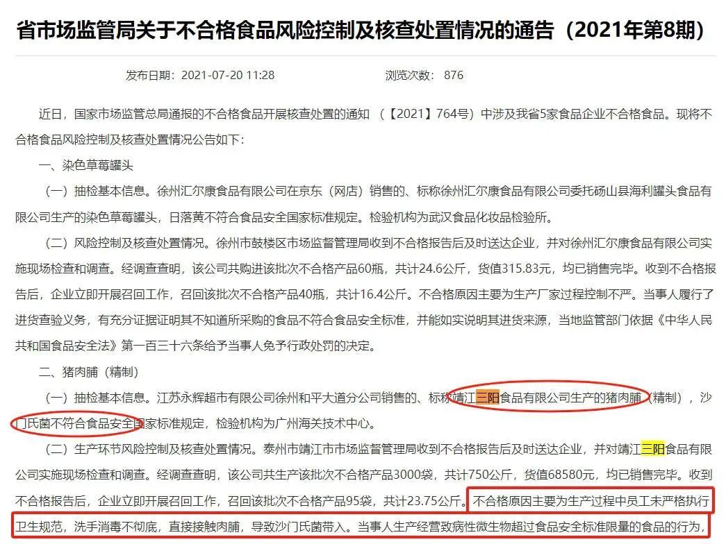 2021年7月20日,靖江三阳食品被国家市场监管总局通报猪肉干产品“沙门菌”不合格。不合格的原因是生产过程中员工没有严格遵守卫生规范,洗手消毒不彻底,接触肉干,导致沙门菌进入。。由此可见,这家代工厂在食品安全内部控制方面存在诸多漏洞。此外,靖江三阳食品于2022年7月和2024年8月连续两次被靖江市市场监督管理局责令整改。
