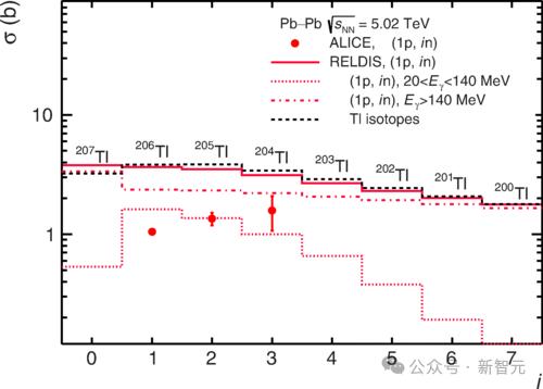 测量(圆圈)和通过 RELDIS(实线条形图)计算的给出数量中子I伴随着208Pb核UPCs中单个质子的发射截面。