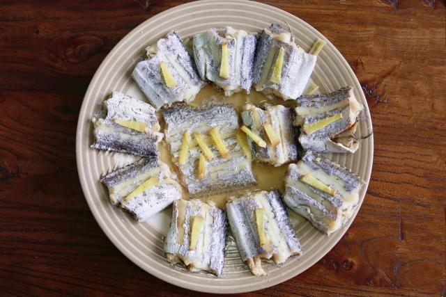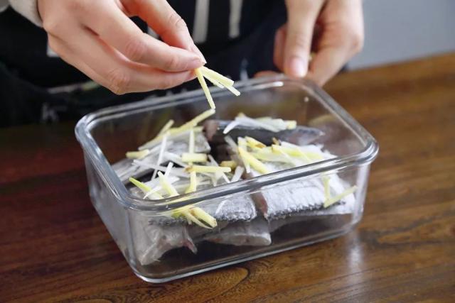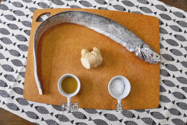 2. 用姜片、米酒、盐腌制带鱼一夜。