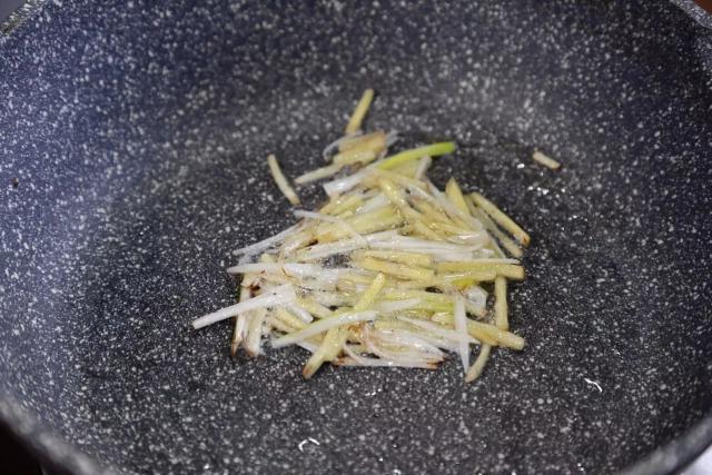 4. 将热锅放入油中,将腌制过的姜片和葱油煎一会儿,香后再香。捞出。