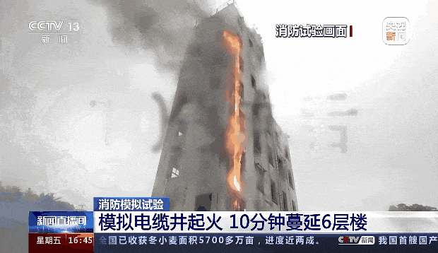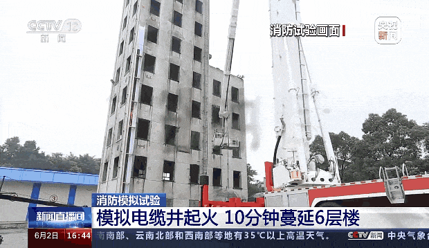 7分钟后,第六层电缆井也被火焰吞噬,上面电缆井内的烧胶滴落到下面的电缆井中,很快点燃了一层电缆井。