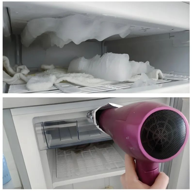 用吹风机吹冰块, 然后清洗冰箱内部。注意远离吹风机。如果吹风机在这个过程中不小心离冰箱太近,吹风机的高温很容易使冰箱内部的一些脆弱零件变形或损坏。