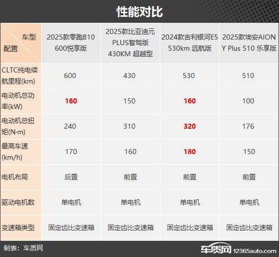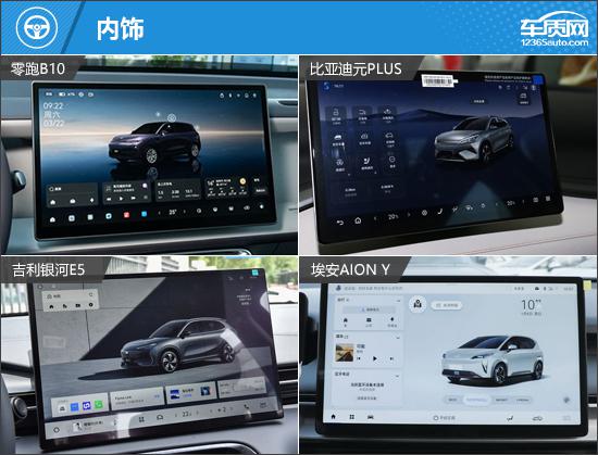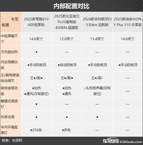 内部配置,零跑 B10 和比亚迪元 PLUS 整体性能比其他两款车型好。前者专属的方向盘加热可以为冬季使用提供更好的体验,后者专属的自动防眩内后视镜可以提高夜间驾驶的安全性。埃安 AION Y 这个环节表现不佳,不但缺少多种装备,还是四款车中唯一没有配备热泵空调和主驾驶座电动调节车型。