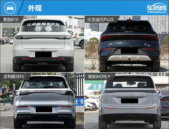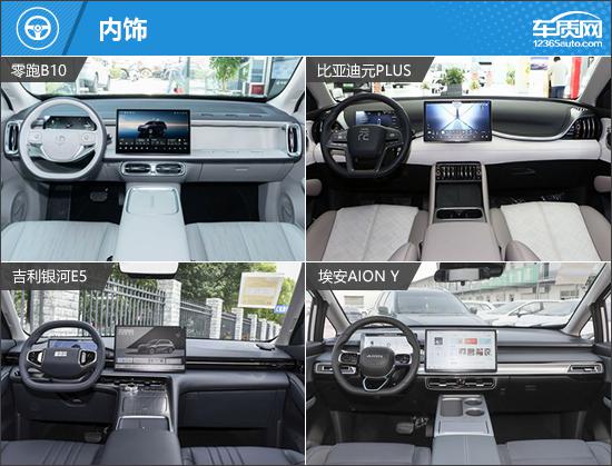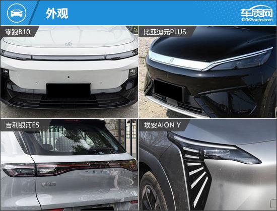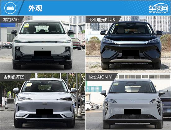 外观方面,四款车均采用封闭式正面,具有典型的新能源汽车特色;同时,在细节处理方面,都有明显的家族元素。零跑 B10 受宇宙中“引力磁场”的启发,两侧的分体式大灯组和贯穿式大灯组 LED 日间行车灯的搭配,进一步增强了车头的科技感和厚重感。零跑作为一款全球车型, B10 车身侧面造型带有一些欧洲车型。比亚迪元 PLUS 采用全新的乐动龙颜前脸,两侧大灯组通过装饰条连接,增强层次感。吉利银河 E5 整体造型圆润饱满,线条简洁温和,营造出优雅的视觉效果。在两侧大灯下加入" C “形状元素,提高了车前的运动感。埃安 AION Y 车头造型极具攻击性,选用超次元设计构思,两侧大灯组接近" 7 “字形,内部还有羽翼式设计,不但个性十足,而且极具辨识度。